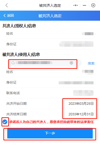 第三步:輸入被綁定人身份證號(hào),選擇共濟(jì)時(shí)間,勾選承諾,點(diǎn)擊下一步,綁定成功。