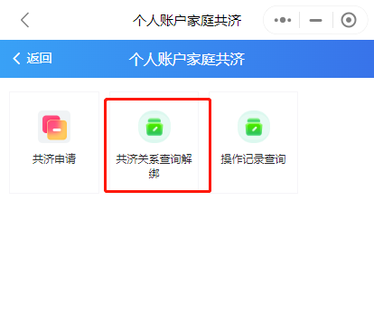 第四步:辦理完成后,可通過(guò)“家庭共濟(jì)”——“共濟(jì)關(guān)系查詢解綁”查詢綁定情況,“解除綁定”功能也可在此界面操作。